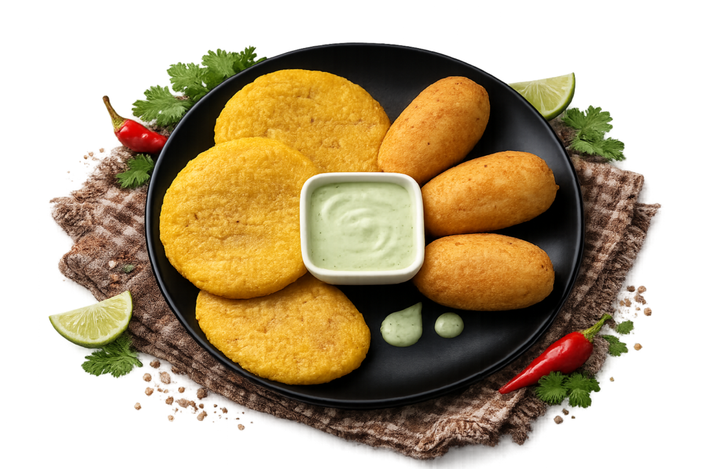 La arepa, dorada y suave, es el clásico irresistible que acompaña cualquier ocasión; mientras que el pastel de yuca, crujiente por fuera y tierno por dentro, conquista con su sabor auténtico y tradicional.